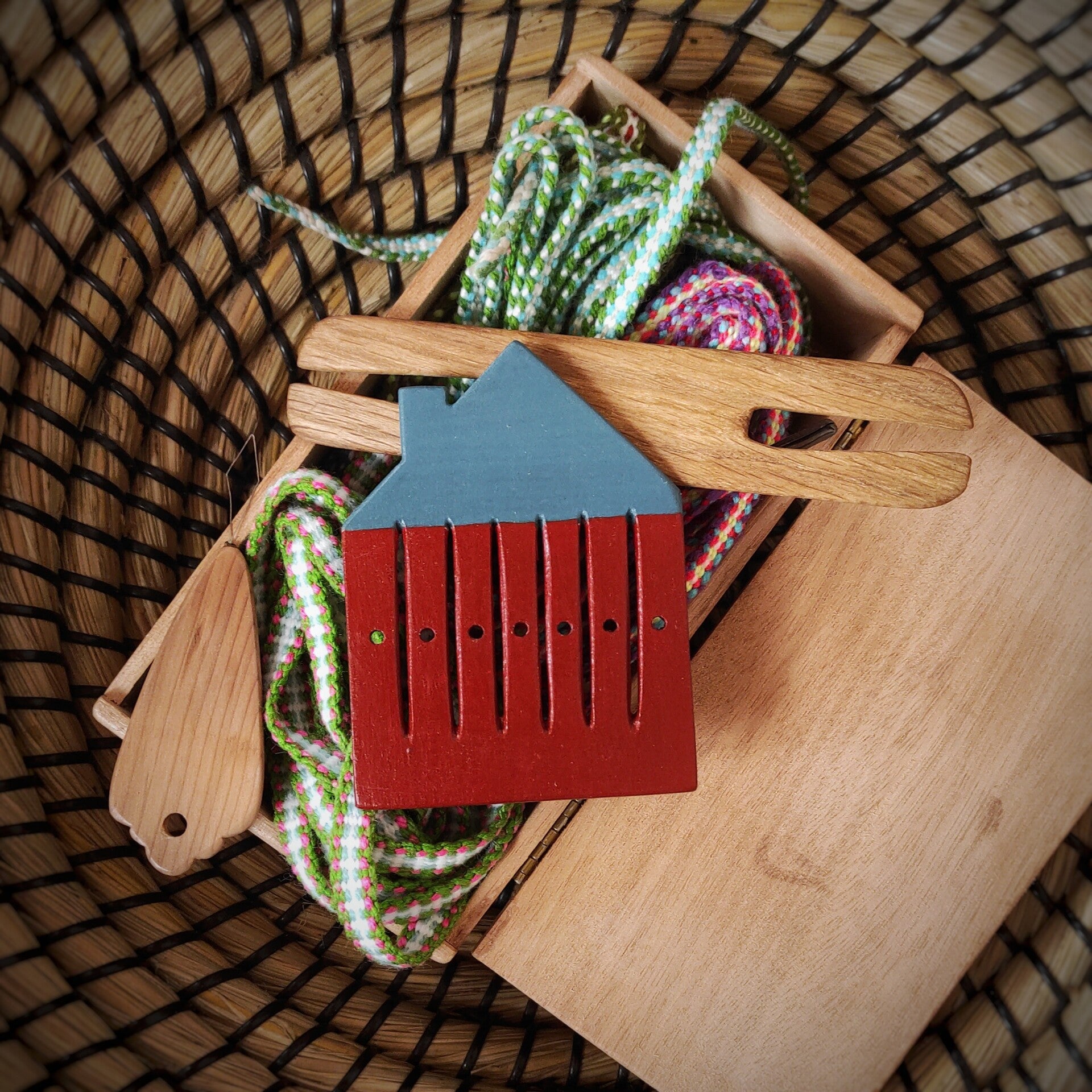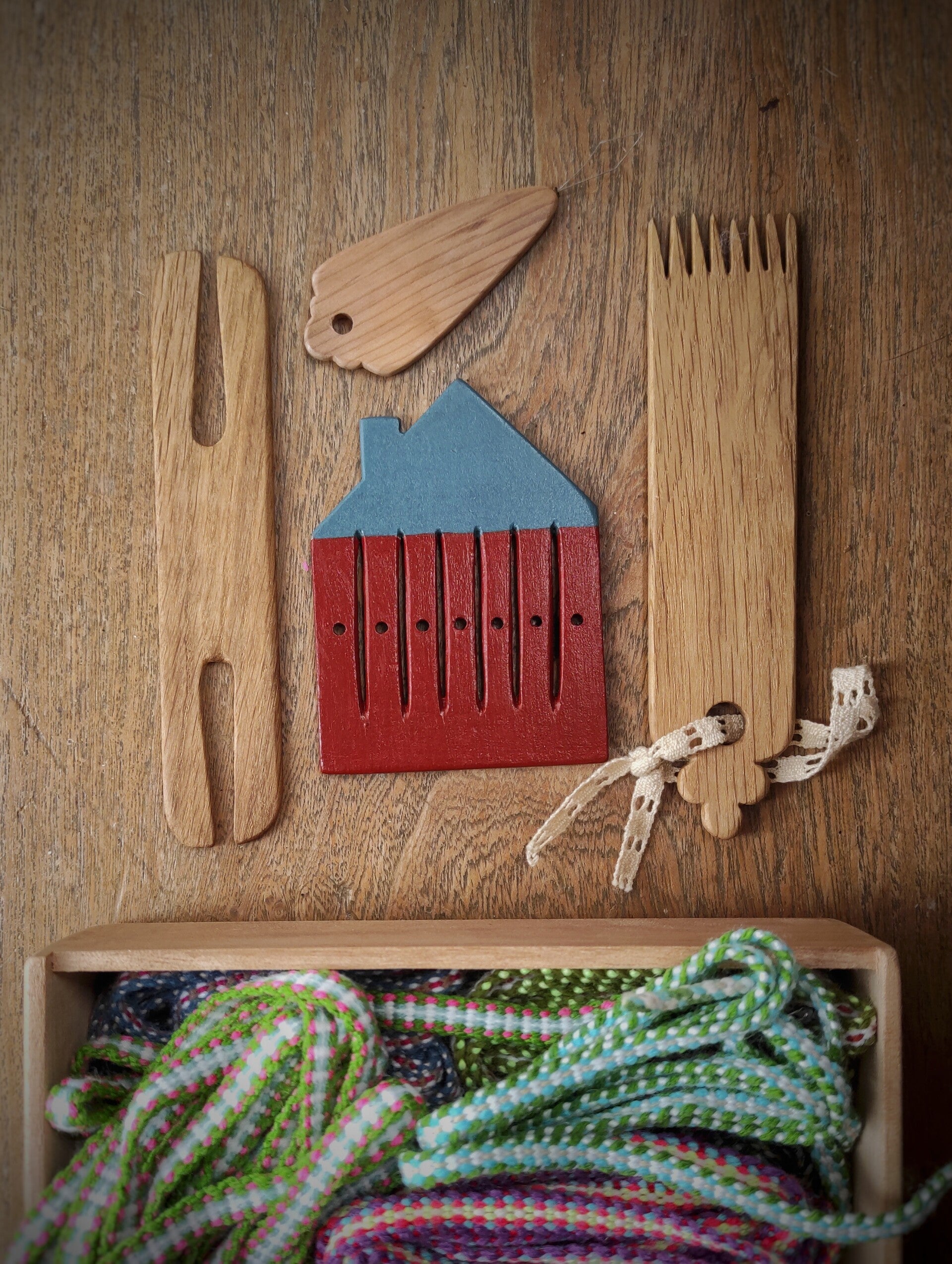 Ce petit peigne,en forme de maison, est idéal pour réaliser bracelets, galons et lacets.