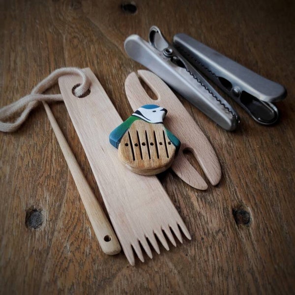 Il est livré avec une aiguille,une navette, un peigne-batteur, un passe-fil et deux pinces inox (assez puissantes pour bloquer votre chaîne de tissage à deux points d'ancrage, tels qu'une ceinture nouée à votre taille et une poignée de meuble).