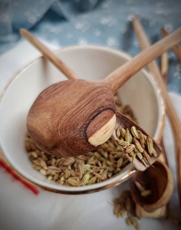 Petites cuillères à épices, en bois naturel (série en orme), légèrement huilées.Toutes ces cuillères ont été sculptées à la main.Longueurs: 19,5 cm / 15cm / 11,5 cm