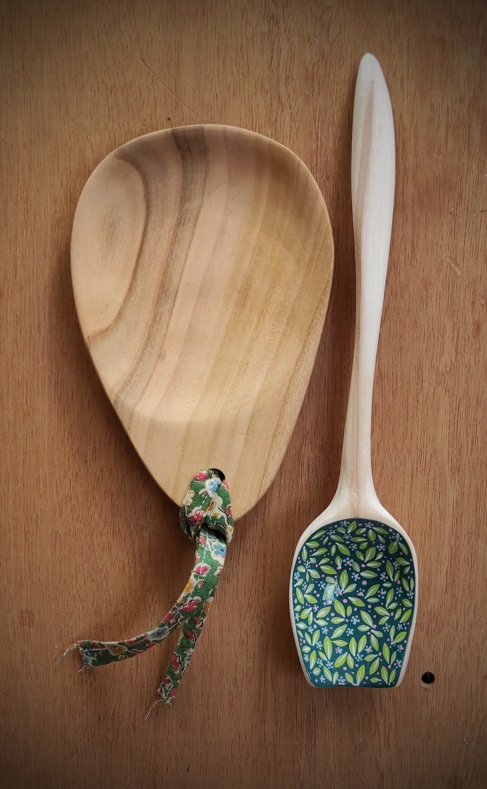 - Une longue cuillère en noisetier, cuilleron peint (finition apte au contact alimentaire; aliments froids et secs)