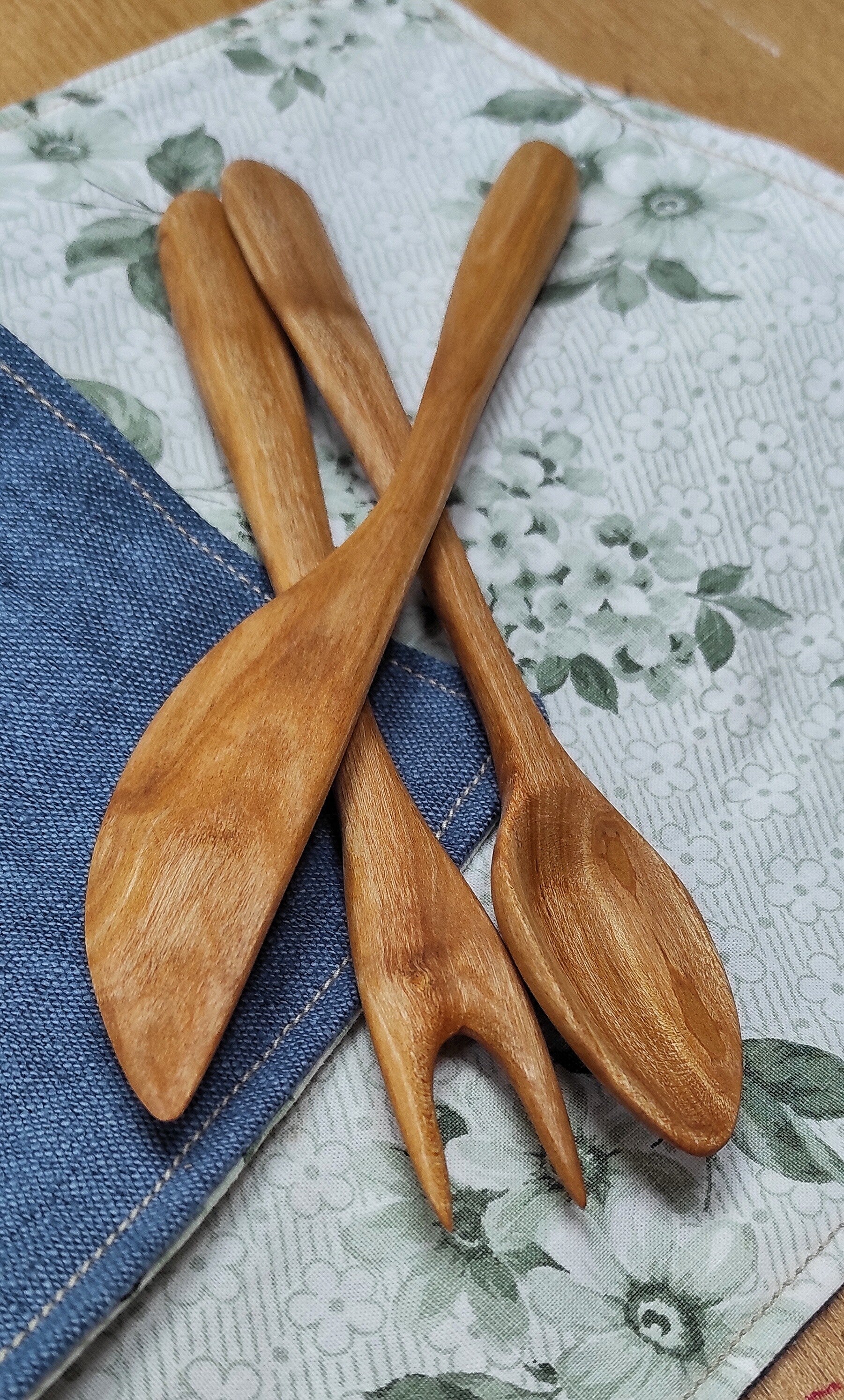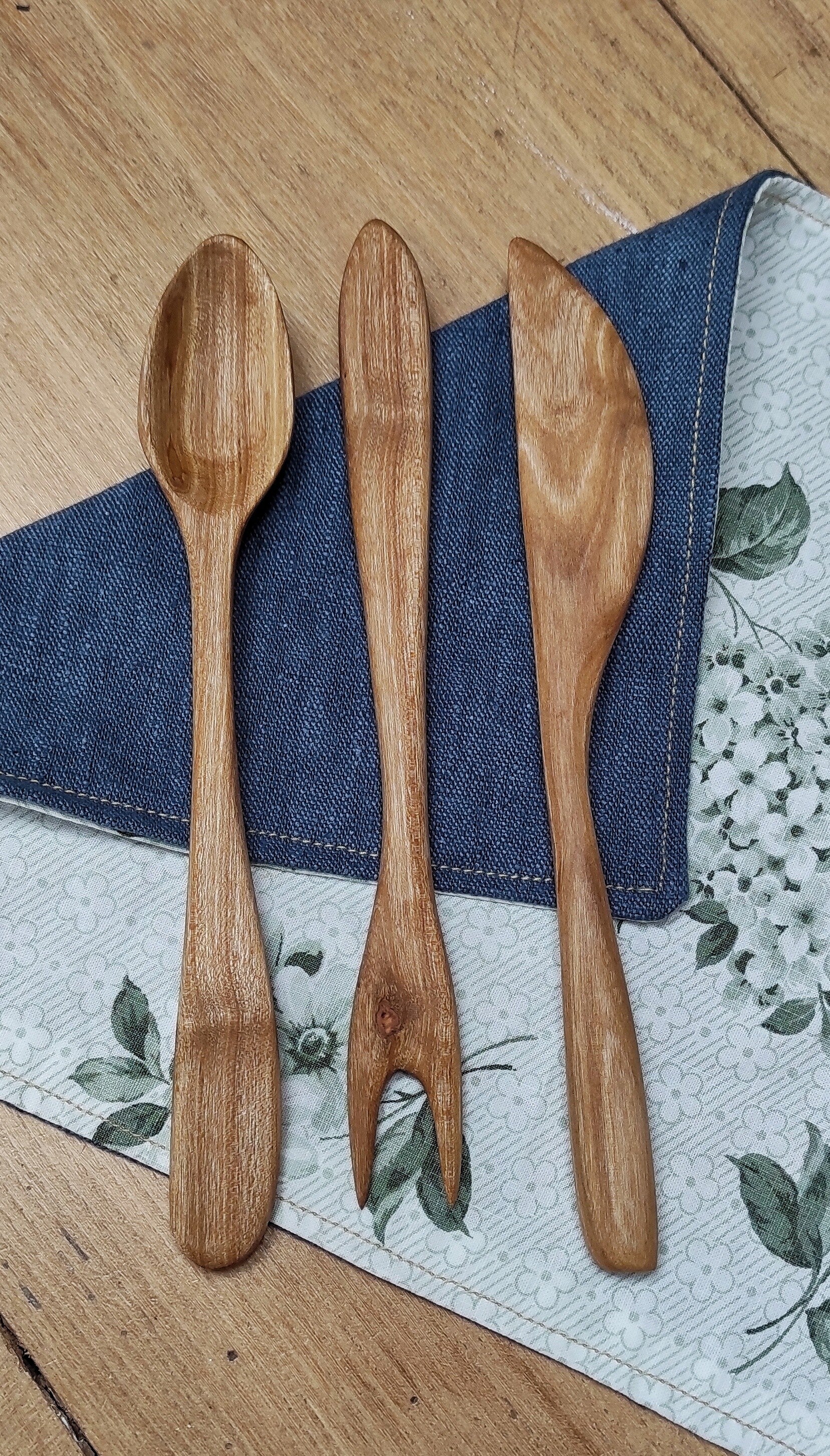 Set de couverts en bois de merisier (cuillère, fourchette à 2 dents, et couteau ), rangés dans une enveloppe textile.